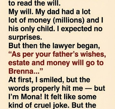 A week later, the lawyer asked us to gather for the will reading. I wasn’t anxious; I was his only child—or so I thought.