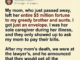 After the funeral, we met at the lawyer’s office to hear the will. I wasn’t thinking about money. I just wanted to know that she had seen the sacrifices I made.