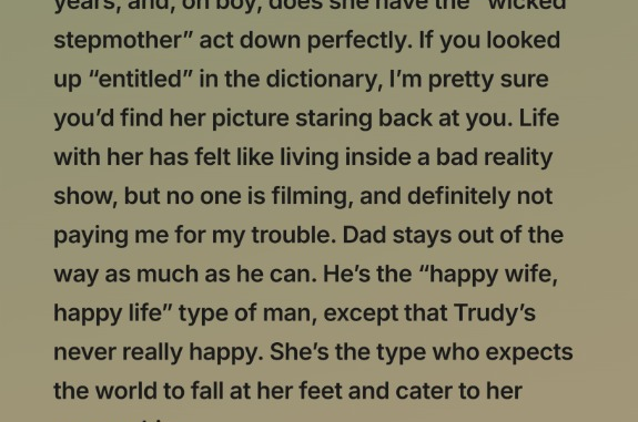 I’m Mia, sixteen, living with my dad and Trudy. She’s been here two years—long enough to unpack her boxes and her ego. If “entitled” had a spokesperson, it would be her. Dad? The classic “happy wife, happy life” guy—except Trudy’s happiness is never satisfied.