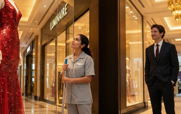 By a boutique window, a woman in a simple slate-gray uniform polished the glass with precise, methodical movements. Time had altered her features, and her attire was modest—but he recognized her instantly.