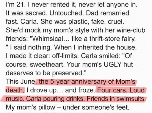 The first anniversary of my mom’s death was unbearable. I planned a quiet day there to honor her, but when I arrived, my heart sank. Cars were scattered across the lawn, music blared, and laughter echoed through the trees.