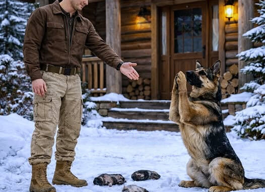 On a freezing winter morning in Brightwater, a mother dog pressed herself close to her four newborn puppies outside a deserted house, trembling and barely clinging to life. Snow drifted down silently, but the threat to them was immediate.