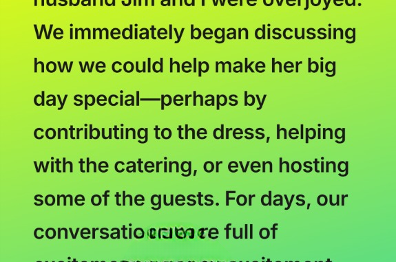 When our granddaughter Sarah shared her wedding plans, my husband Jim and I were thrilled. We immediately started brainstorming ways to make her day unforgettable—maybe helping with the dress, contributing to catering, or even hosting some of the guests. For days, our conversations were full of excitement and nostalgia, remembering her growing up.