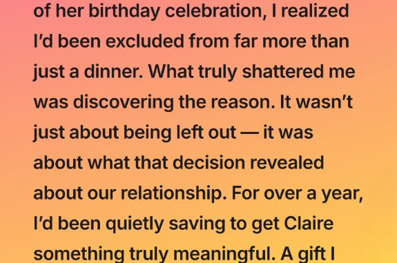 I always thought Claire and I shared everything—our dreams, our struggles, our secrets. But when I discovered she had excluded me from her birthday celebration, I realized I’d been left out of far more than just a dinner.