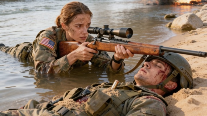Crouched against the canyon floor, Brooke gripped the rifle—a cold, heavy weight that embodied the reality of war. Eli shielded her as she applied Dorsey’s lessons, calculating angle, distance, and wind to line up her target: an enemy spotter directing fire at the American survivors. Her first shot rang out, silencing him instantly. When a second sniper emerged, she tracked and neutralized him with the same calm precision.