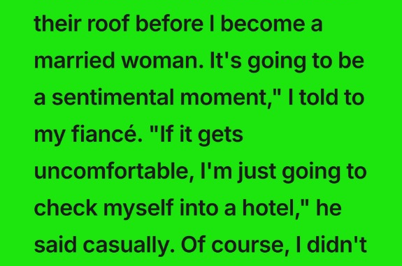 We had come to visit my parents so Adam could meet more of my family before the wedding. They insisted we stay at the house. Adam preferred a hotel, but I wanted one last visit to my childhood home before starting my own life.