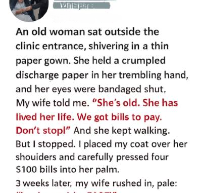 The wind that morning cut sharply through the clinic’s parking lot, carrying the sterile scent of antiseptic. My wife and I had just stepped outside when I noticed her: an elderly woman sitting alone on a concrete bench, trembling in a thin disposable gown, her legs pale against the cold pavement. Thick bandages covered her eyes. She couldn’t see the people passing, the cars moving, or that no one had stopped for her.