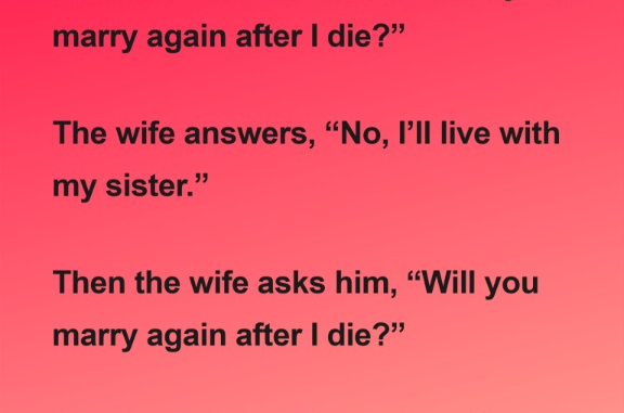 A husband once asked his wife, “Will you remarry after I’m gone?”