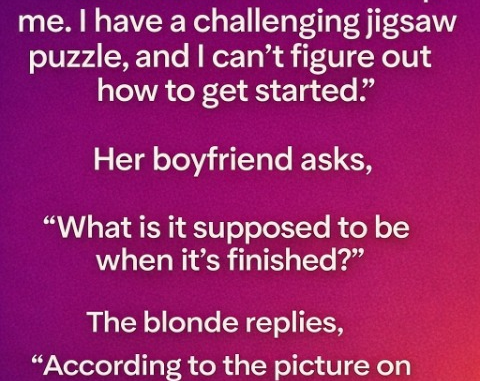 She called her boyfriend for help, saying, “I’m stuck on a really tricky jigsaw puzzle and don’t know how to begin.”