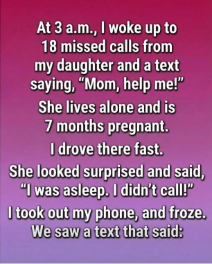 At three a.m., my phone kept buzzing—eighteen missed calls and one urgent message. My daughter’s name appeared on the screen, followed by just four words: “Mom, help me.” Instantly, panic set in. She lived alone, seven months pregnant, and every protective instinct in me surged. Without a second thought, I grabbed my keys and sped through the deserted streets, hoping I wasn’t too late.