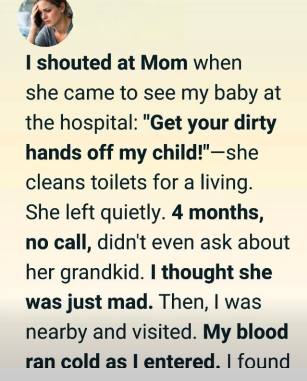 At the time, I felt justified—exhausted, overwhelmed, and tangled in emotions I barely understood. My mother had spent years cleaning bathrooms in offices and public spaces, work that was invisible but essential. I had long buried my embarrassment and resentment, but in that hospital room, holding my newborn, it all poured out in one cruel sentence.