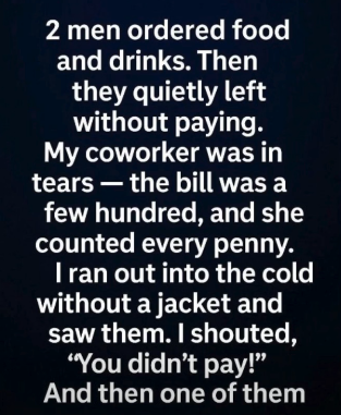 One chilly winter evening, two men walked into our small café, ordered a large meal with drinks, and seemed perfectly ordinary. But when it came time to pay, they quietly slipped out without leaving a cent. My coworker Mia froze, staring at the bill—it totaled several hundred dollars.
