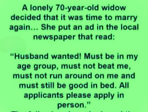 Growing older can bring a quiet, persistent loneliness, especially after losing a long-time partner. For a seventy-year-old widow, the emptiness of her home eventually became too heavy to bear. Determined not to spend the rest of her life alone, she took a bold, old-fashioned step: she placed a carefully worded ad in the local newspaper, outlining exactly what she wanted in a husband, drawing on the wisdom of her years.