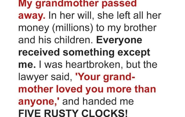 Brian, the elder sibling, inherited their grandmother’s modest countryside home. Linda, the quiet younger sister, received five old, rusted pocket watches. Brian couldn’t hide his amusement.