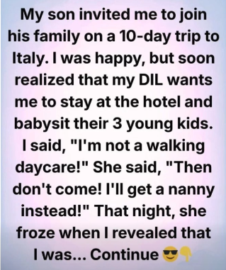 When I later informed them that I’d still be going—paying for everything myself—my daughter-in-law was clearly stunned. My son tried to convince me to help with the kids, saying that’s what grandmothers are supposed to do.