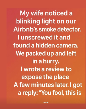 The first thing my wife noticed was a small blinking light. It wasn’t obvious or loud—just a faint, steady flash coming from the smoke detector near the kitchen doorway. At first, we brushed it off as a simple low-battery warning. But something about it didn’t sit right. Maybe it was the timing, or maybe it was the uneasy feeling we already had since arriving at the Airbnb.