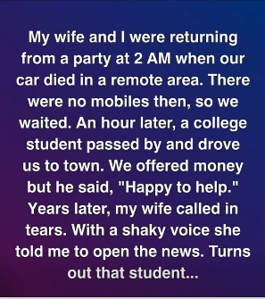 A beaten-up car slowed and pulled over. A young man stepped out and immediately asked if we were okay. Without any hesitation, he offered help. He refused payment, saying he was just glad he could be useful. His calm kindness instantly eased the fear we had been sitting with.