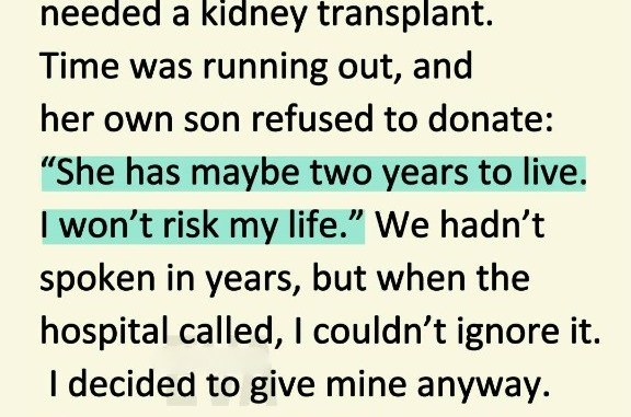 I didn’t give her my kidney for gratitude. I didn’t do it to fix the past. But in saving her, something fragile inside me healed too.