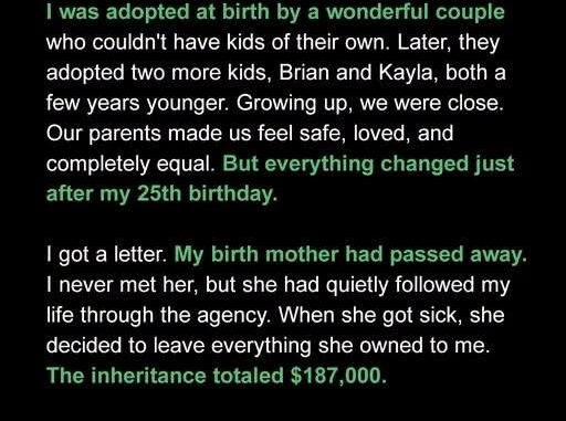 It informs her that her biological mother, Alina—whom she never met—has passed away after secretly following her life from a distance. Before her death, Alina named Taylor as the sole heir to her estate, leaving behind her home, insurance policy, and savings totaling $187,000.