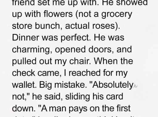 When the bill arrived, he confidently insisted on paying, saying it was proper for a man to cover the first date. It felt a little traditional but still thoughtful. He later walked me to my car, and everything seemed perfectly fine.