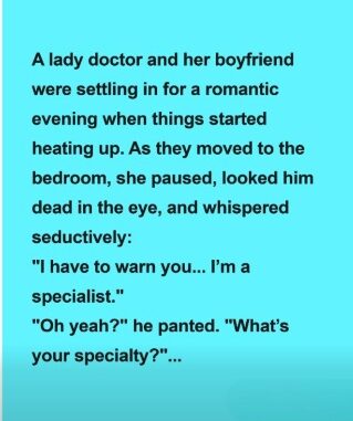 Looking at him with a calm, slightly playful expression, she warned him that there was something he should know. When he asked what she meant, she smiled and said she was a specialist.