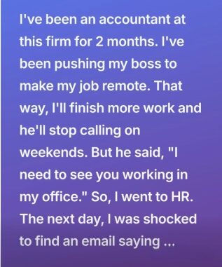 Not long after, a new company-wide policy required all accountants to return to full-time office work without exceptions. The timing felt connected to everything that had happened. When I raised concerns again, HR told me that department heads had broad authority and suggested that filing a formal complaint could become complicated.