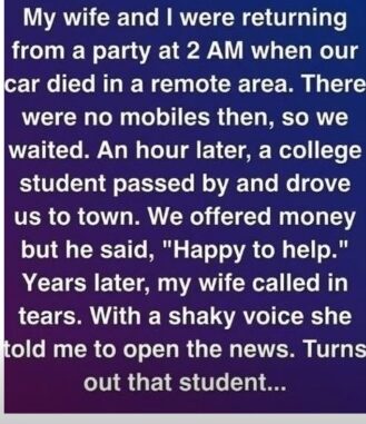 A car pulled over behind us, and a young man stepped out without hesitation. There was no suspicion, no questions—just immediate willingness to help. He acted as though stopping for strangers on a deserted road in the middle of the night was the most natural thing in the world. His calmness eased the panic we had been feeling.