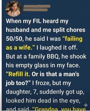 At first, her father-in-law’s comment felt dismissive and shaped by old-fashioned beliefs. When he joked that sharing household responsibilities meant she was “not doing her job as a wife,” she chose to stay calm, saying nothing and continuing to live by her belief in equality at home.