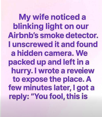 During an Airbnb stay, the narrator’s wife spotted a small blinking light on a smoke detector that seemed out of place. When he took a closer look, he realized something alarming—a lens appeared to be hidden inside the device, suggesting it might be a camera.