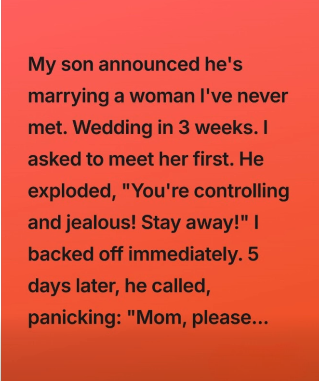 My son surprised me when he announced he was engaged to a woman I had never met—and that the wedding would take place in just three weeks. When I gently asked to meet her first, he reacted angrily, accusing me of being controlling and jealous. His words hurt deeply, and I stepped back, confused and unsettled by how quickly I had been shut out of his life.