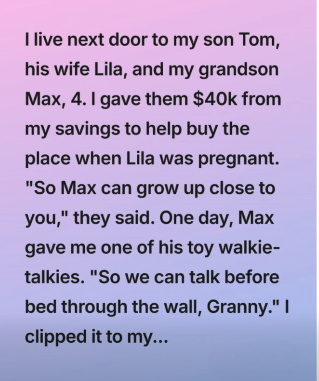 We live in nearby apartments. I even helped my son and his wife, Lila, buy theirs, contributing $40,000 from my retirement savings so they could live close and raise Max. I truly believed it was the right thing to do.